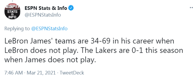 生涯至今,詹姆斯一共缺席103场比赛,在他缺席的比赛中,他所在球队的战绩为34胜69负。詹姆斯本赛季仅缺席对国王的一场比赛,湖人也输掉了那场比赛。