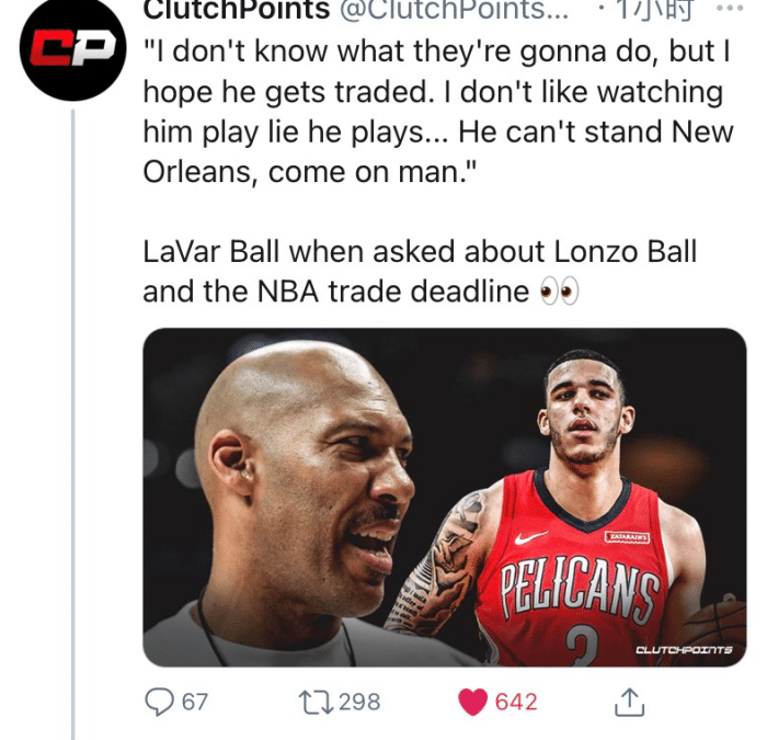另外据名记Marc Stein报道,联盟消息人士透露,快船正探索在交易截止日前得到郎佐-鲍尔的方法。快船缺少控卫是众所周知的事情,关于球哥的交易传闻也一直都有,但随着他近期三分手感和助攻数出色,鹈鹕也一直没启动交易,但不代表他不可被交易!