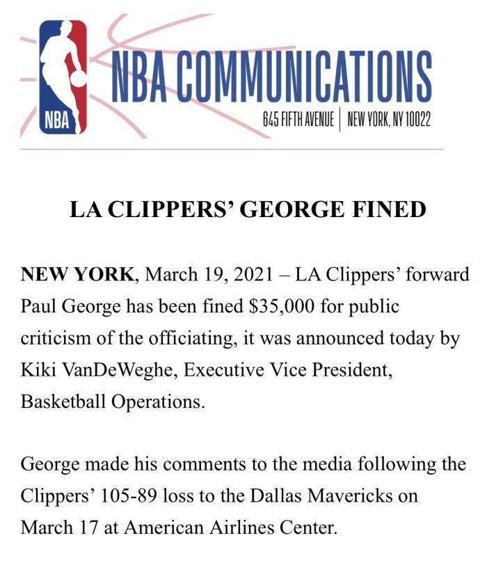 3.5万美元!联盟再开罚单,乔治因批评裁判遭重罚:除了假摔啥都做不了