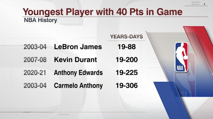 第二、爱德华兹年仅19岁225天轰下40+,超越安东尼、比肩詹姆斯和杜兰特成NBA历史上轰下40+第三年轻的球员,詹姆斯19岁88天时轰下40+高居历史第一。