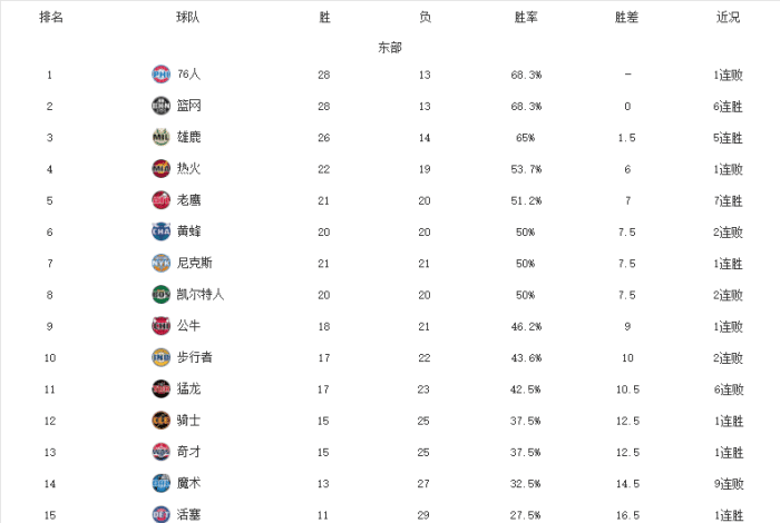 费城昨天加时输给雄鹿,不过他们依旧位居东部第一,他们的实力还是很强的,只是伤病侵袭严重。篮网昨天逆转击败步行者之后豪取6连胜,他们的战绩也追平了榜首。雄鹿近期拿下了5连胜,在字母哥的带领下他们表现很出色。热火昨天输球之后结束连胜,不过近13胜11负的成绩还是很不错的。黄蜂今天对阵湖人。老鹰自从换帅之后已经7战全胜,他们今天又击败了雷霆。尼克斯今天击败魔术,他们的战绩是21胜21负,胜率50%;凯尔特人近期吃到了2连败,史蒂文斯的球队这个赛季表现不佳。