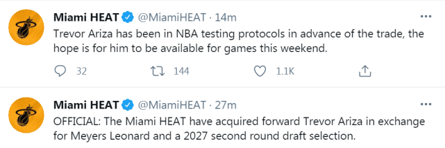 来源:24直播网03-18 19:1824直播网讯 北京时间3月18日,热火官方宣布,球队已经和雷霆正式完成交易,他们送出了梅耶斯-莱昂纳德和一个2027年的次轮签,得到雷霆的小前锋特雷沃-阿里扎。热火官方还表示,阿里扎有望在本周末的比赛中登场。