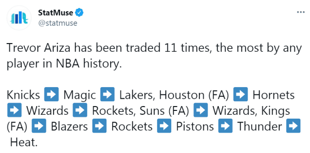 数据网站StatMuse指出,这是阿里扎生涯第11次被交易,被交易次数在NBA历史上排名第一。从尼克斯开始,阿里扎先后被交易到魔术、湖人,自由球员签约火箭,然后又被交易到黄蜂、奇才、火箭,自由球员签约太阳,继续被交易到奇才,自由球员签约国王,随后被交易到开拓者、火箭、活塞、雷霆和热火。