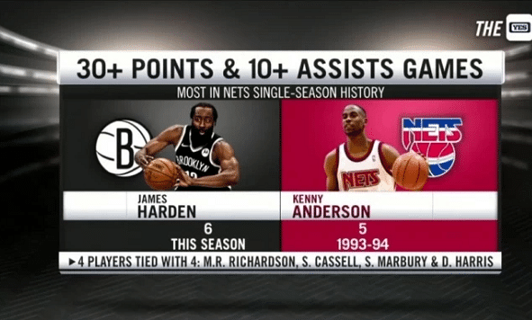 篮网队史第一人,哈登以3次至少砍下30分15助攻,成为篮网队史第一,