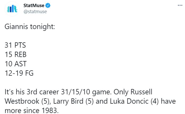 据美媒statmuse统计,这是字母哥生涯第3次送出至少31分15板10助攻,NBA自1983年以来,仅次于韦少的5次、拉里伯德的5次、东契奇的4次!