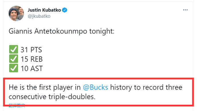 31+15+10!字母哥连续3场三双创2大队史纪录!冲击MVP三连庄