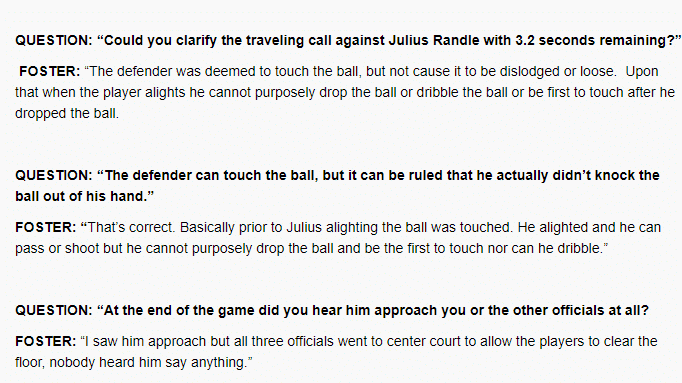 主裁福斯特:欧文碰到了球,但是没有造成球完全脱离兰德尔的控制或者争球,因此兰德尔落地之后,他不能再拍球或者运球;事实上兰德尔起跳之前欧文就碰到了球,兰德尔落地之后,他可以传球,也可以投篮,但他不能继续拍球或者运球。