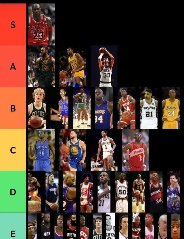 一般来说这一档超巨的历史排位争议是最大的,虽然都在前十之列,但是各家美媒会排出不同的名次,尤其是科比和邓肯!有的美媒会把他们碰到第五名、第六名的位置,也有美媒会把他们放在第十边缘,邓肯排名低的原因是他太低调了,而科比则是因为他的打铁数,但无论是球员还是球迷都对他的钦佩不已,尤其是他的曼巴精神!