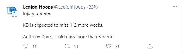 篮网对待杜兰特的腿筋十分谨慎,可能会因伤再缺席1-2周,本周杜兰特将再次接受一次复查;湖人对待浓眉的小腿伤势同样非常谨慎,此前复查后湖人官宣浓眉将在2周后再次复查,但名记表示浓眉可能会缺席接下来三周或更长的时间,即使以球队战绩下滑为代价,湖人也愿意等待。