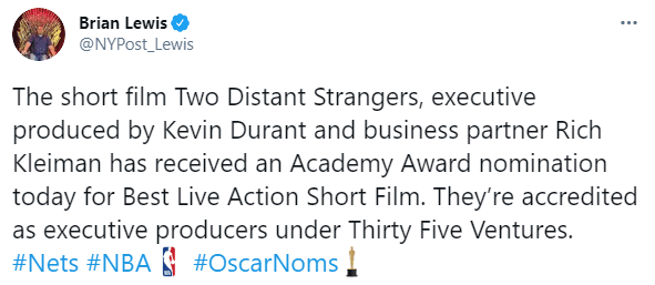 恭喜!杜兰特制作的短片获奥斯卡提名,亲自宣布新投资+打造商业帝国