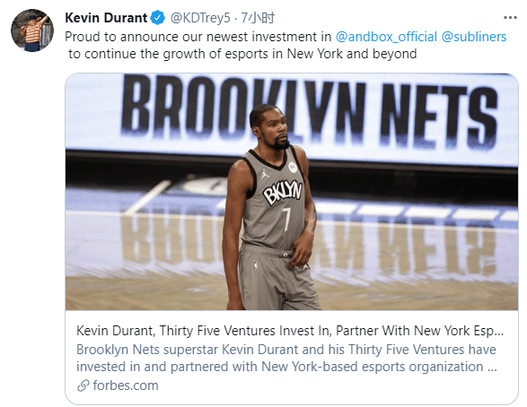 不久前,杜兰特亲自宣布新的投资,发推写道:很自豪地宣布我们在纽约的最新投资,继续投资电竞事业成为Andbox的创意合作伙伴。