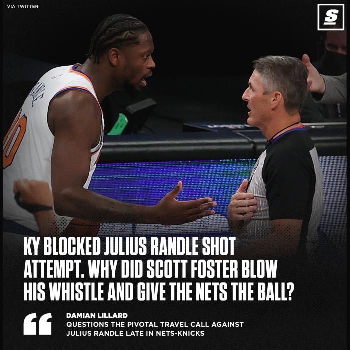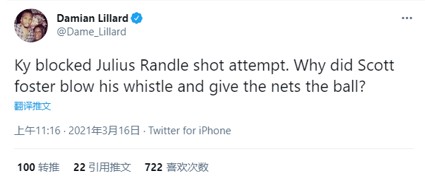 兰德尔走步争议球引热议,开拓者当家球星利拉德发推写道:为什么欧文盖掉兰德尔的投篮,主裁判却响哨并且把球判给篮网呢?利指导很疑惑,目前篮网和尼克斯主裁已经解释清楚了。