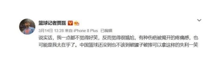 从综艺的效果来说,这一波操作是综艺感十足,可是这一波操作也让很多媒体人感到不满,比如就有媒体人站出来表示,什么时候中国足球可以鞭策中国篮球了,也有著名记者贾磊的愤怒表态,贾磊表示我一点都不认为这个节目好笑,反而觉得很尴尬,因为伤疤被揭开,中国篮球也没有到一笑而过的地步!