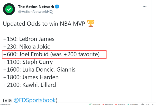 詹姆斯在赔率榜上以+150(即投注100美元,正确则连本带利250美元)排名第1,约基奇+230排名第2,恩比德+600排名第3(注:恩比德受伤前+200位居第1),库里+1100位居第4,东契奇和字母哥同为+1600,并列排在第5位。哈登+1800仅列第7位,利拉德和小卡同为+2100,并列排在第8位。
