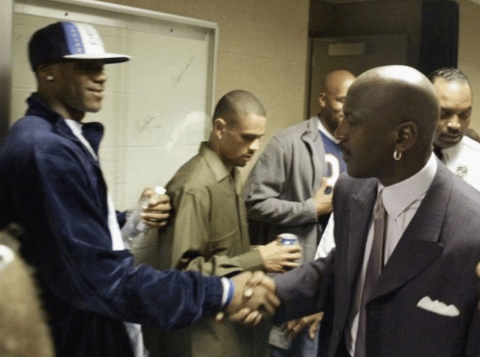 乔丹第二次复出纯属玩票性质,虽然草草打了两年就又退役了。但他在40岁的高龄时,依旧可以交出场均20+的得分。他退役时,詹姆斯刚进联盟。詹姆斯年少成名,是典型的天之骄子。但詹姆斯见到篮球之神后,就显得青涩与害羞了许多。两人简单的一个握手,就勾勒出了一副,黑帮老大见小弟的画面。不用说,乔丹就是那个气场十足的黑社会扛把子!