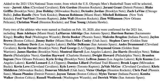 美国男篮公布57人奥运集训名单!篮网六将上榜居首,六队无人入选