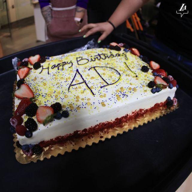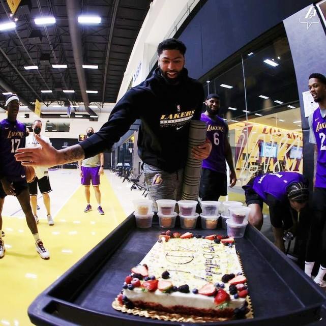 28岁浓眉训练场过生日!湖人队为他准备草莓蛋糕,詹姆斯劈扣抢镜