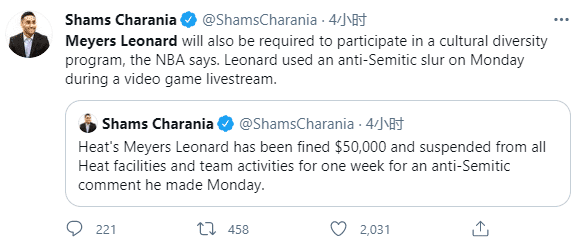 联盟总裁代表官方发表声明:梅耶斯-伦纳德的言论充满伤害,不可原谅。这种冒犯性的话语在NBA和我们这个社会中没有容身之地。昨天他已经与相关官员沟通去更好认识自己言论的影响。我们认为他已然十分悔恨。我们与他进行了更深入的对话,告诉了他这种言论是不可原谅的,并希望他可以践行联盟的核心价值观。