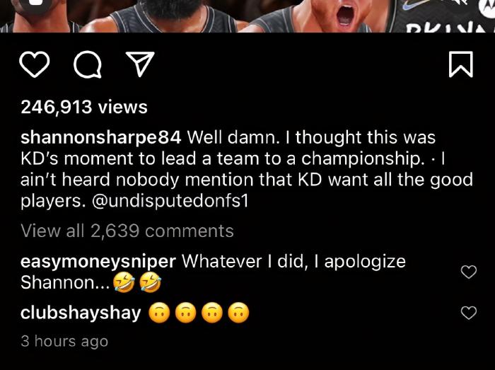 经常上网冲浪的杜兰特也是看见了这个评论员的言论,他并没有回避这件事情,反倒是直接在这个评论员的社交媒体下面回复了。杜兰特直言:不管我做了什么,我都向你道歉。这句话后面还紧跟了几个哭笑不得的表情,很显然杜兰特自己也知道自己现在的抱团行为有多么恶劣,只不过他并没有悔意。因为杜兰特现在已经很清楚联盟的规则,只要你能拿到总冠军,那么抱团也会被洗白。