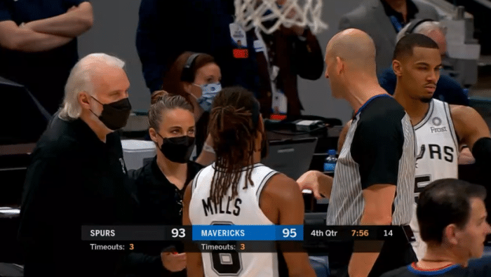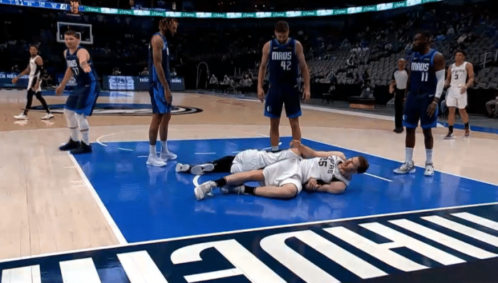 第四节7分56秒,德里克-怀特持球突破上篮,岂料独行侠替补中锋直接从背后推倒铂尔特尔,然后后者撞倒怀特,怀特身体失去平衡,从空中摔倒;考利斯坦这一次“隔山打牛”恶犯动作险些弄伤怀特和铂尔特尔,对于这一幕,裁判多次回放,最终吹罚考利斯坦一级恶意犯规,马刺获得两罚一掷,考神小弟这动作太脏了。