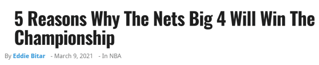 北京时间3月10日,美媒Fadeaway World预测篮网将拿定2021年的NBA总冠军,并列出了五大理由——