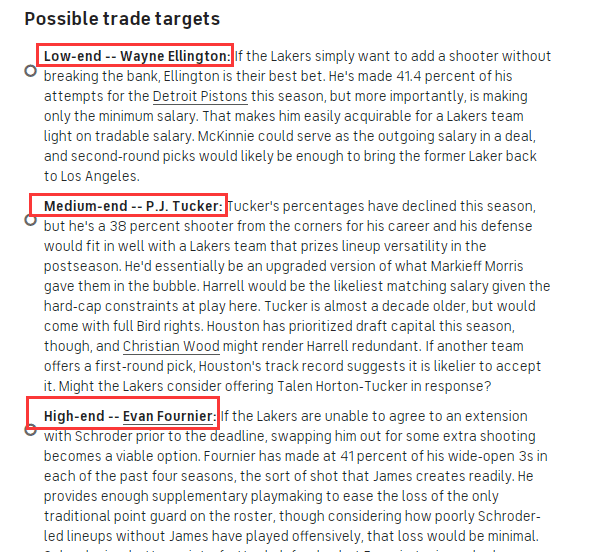 PJ-塔克算是湖人中等级别的目标。塔克本赛季的命中率下降了不少,但他依然是一个生涯底角三分命中率38%的球员,而且他的防守非常适合湖人的体系。火箭想要年轻的筹码,为了火箭的塔克,湖人可能要损失包括霍顿-塔克在内的年轻人。