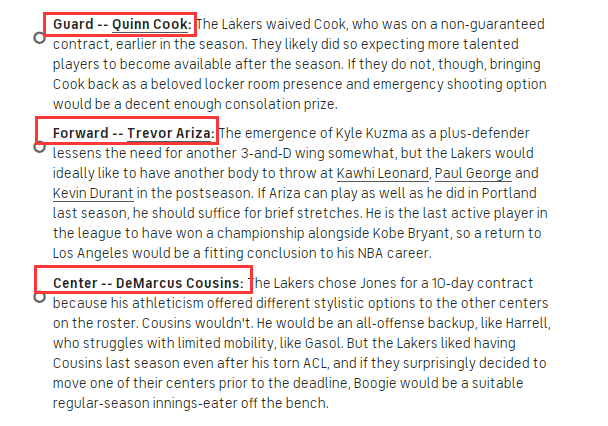 那么在自由球员市场上,湖人可能有哪些选择呢?CBS列出的三个人选包括库克、阿里扎和考辛斯。湖人之前裁掉了库克,是为了中期引援做准备,但如果湖人得不到强有力的新援,签回库克未尝不是一个合适的选择。