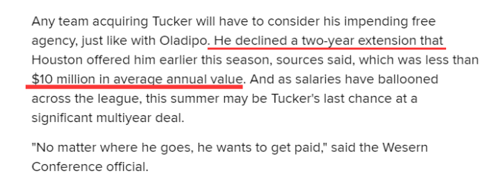 塔克在火箭的合同今夏到期,而到了今年5月份,塔克将会36岁,今年夏天将是他最后一次获得多年合同的机会。