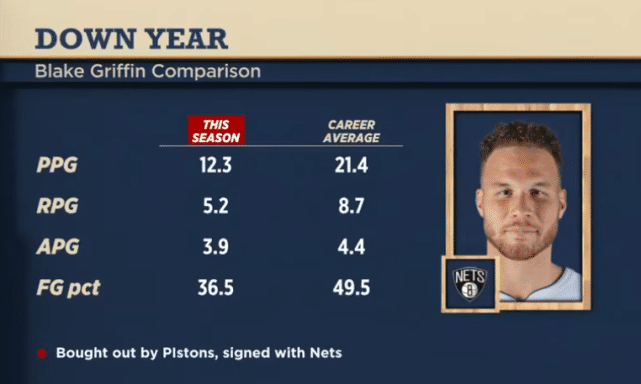 格里芬加盟篮网,会给球队带来多大的帮助呢?最新一期的The Jump节目就此展开讨论。名记扎克-洛维在节目上谈到了自己的观点。洛维认为格里芬来到篮网后,他的状态会有所提升。理由一,加盟一支冲冠球队,格里芬自身的动力会提升,他会打得更卖力;理由二,在三巨头身边打球,他的投篮会轻松得多,不用再费力地摆脱防守后撤步三分,更多时候只需要接球空位出手三分。