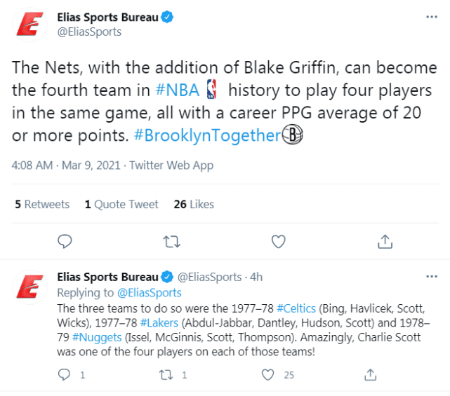 来源:24直播网03-09 10:5824直播网3月9日讯 ,格里芬正式签约篮网。数据网站EliasSports指出,篮网将成为NBA历史上第四支在同一场比赛拥有四位生涯场均得分20+球员的球队。生涯至今数据方面,杜兰特场均27.1分,哈登场均25.2分,欧文场均22.7分,格里芬场均21.4分。