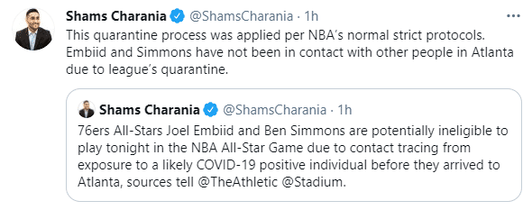 来源:24直播网03-08 20:0624直播网讯北京时间3月8日,距离NBA全明星正赛只剩下不到8小时时间了,然而根据名记报道,NBA全明星名单将发生了变动,西蒙斯和恩比德因为接触了新冠阳性的理发师将缺席比赛,幸运的是西蒙斯和恩比德并未接触其他全明星球员,根据联盟规定,这两位全明星球员将在亚特兰特隔离,锡安将进入杜兰特队首发。