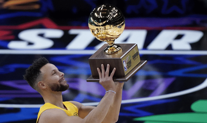 全明星正赛库里是替补才第一次参加的,他在第二节初期代表杜兰特队和詹姆斯队的保罗跳球,两人的身高都不高,所以关注度很好,大家满满的期待,最终保罗跳球成功,他兴奋的庆祝,同样庆祝的还有场边詹姆斯队的库里,他就好像自己跳球成功了一样,而康利跳球失败,“小个对决”失利了。