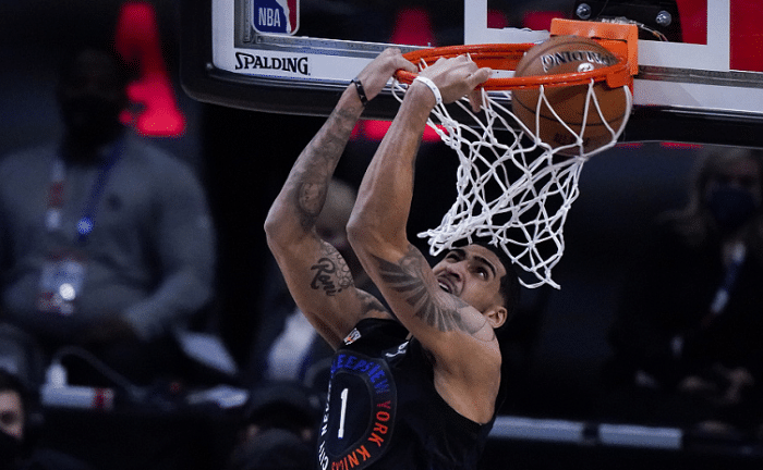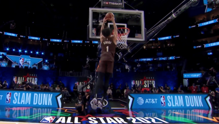 第三个出场的是安芬尼-西蒙斯,他的篮筐上还有一个框,起跳后平框,然后扣篮成功,得到46分。