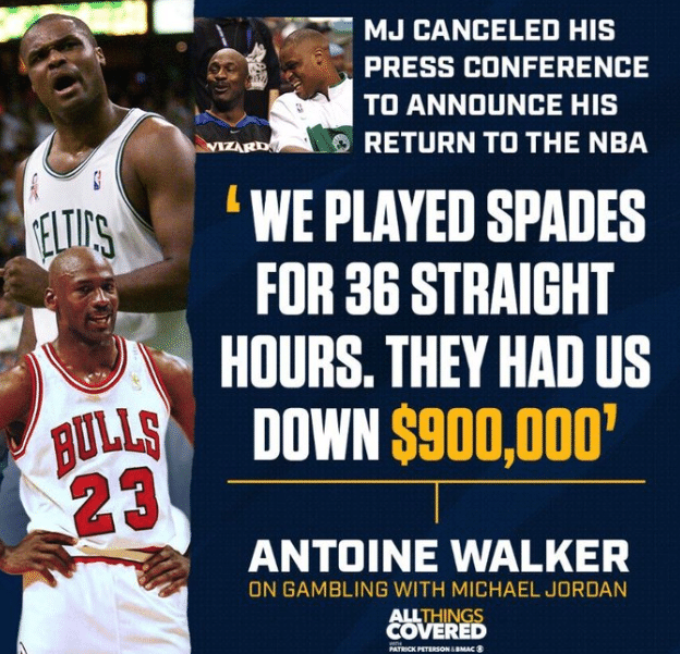 沃克在播客中说道:“迈克尔的牌局一向玩得很大,如果你的手里没有足够现金,你根本没资格上桌,我记得是两万美元才能上桌。”沃克还回忆有一场牌局打得惊天动地:“我跟迈克尔组队,同另外两个人打,我们最多输了90万美元!但是乔丹绝不言败,我们居然连玩了36个小时,乔丹甚至因此取消他重返篮坛的记者会。没人知道他为何取消,内幕其实是他正在玩牌。我们一路追杀,最少只输两万美元,但乔丹仍不罢休,最后他累得趴在牌桌上睡着了,我们因此又倒输回去18万美元。”