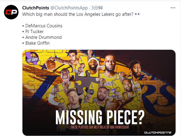 美媒《Clutch Points》晒图并且发问:湖人应该引援哪一位大个子球员?自由球员考辛斯、火箭悍将PJ塔克、骑士球员德拉蒙德和自由球员格里芬;虽然塔克身高仅1米96,但美媒仍视他为大个子球员,因为塔克支撑火箭内线,尤其是打小个阵容时,塔克经常打5号位。