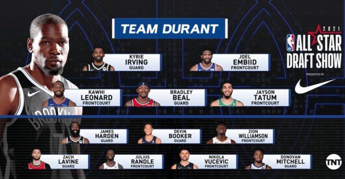 杜兰特虽然因伤不参加全明星,但仍然选出了自己的阵容,塔图姆替代KD进入首发,另外4人分别是德鲁大叔、大帝、小卡以及比尔。替补阵容则是哈登、布克、锡安、拉文、兰德尔、武切维奇以及米切尔。