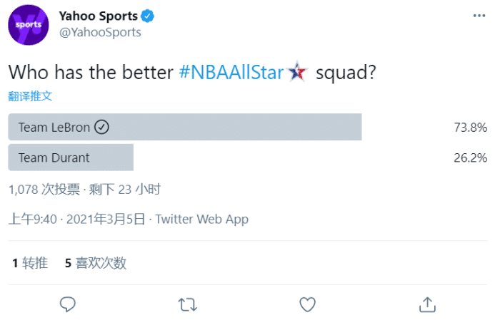 那么问题来了,从纸面阵容来看,詹姆斯队和杜兰特队哪个更强呢?可以看到,雅虎体育做了一个投票,超过7成的球迷认为詹姆斯队更出色!