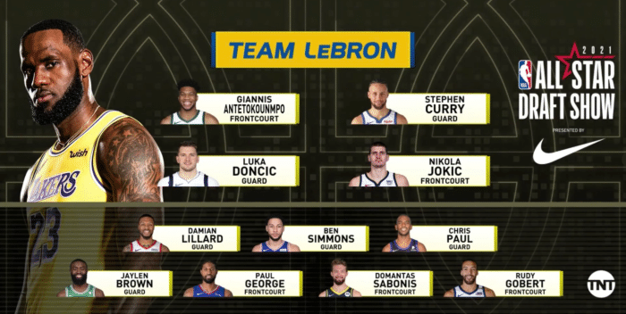 如果3月8日的全明星赛打得足够激烈,那么在决胜时刻,詹姆斯队既可以派出约基奇、字母哥、詹姆斯、保罗、乔治这样攻防俱佳的常规五人组,也可以拿出詹姆斯、字母哥、利拉德、乔治(或者保罗)、库里这样的死亡五小组合。詹姆斯队无论是进攻端还是防守端都有更多的人选!