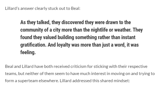 两人很快建立了友谊,利拉德表示:“我们有着相同的心态,我们不是反对那些组队打球的人,只是我们的选择不同。我们想走自己的路,我们也知道这意味着什么。”那年夏天,利拉德和球队签下4年1.96亿美元的合同,而比尔随后也2年7200万美元提前续约。比尔之后表示,和利拉德的聊天对他很有帮助,“总有人选择不容易的事情,历史证明了这一点。”