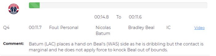 末节46.5秒,小卡持球进攻时有一个伸手的动作,打到比尔的面部被吹罚进攻犯规,裁判报告显示这次吹罚正确;终场前11.7秒快船落后1分,暂停回来巴图姆和雷吉-杰克逊包夹比尔,本想抢断却被吹犯规,当时巴图姆的表情显得十分无辜,裁判报告显示这是一次错判,巴图姆对比尔的接触不构成犯规。