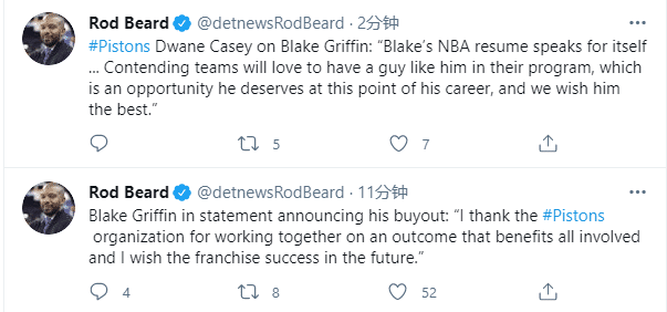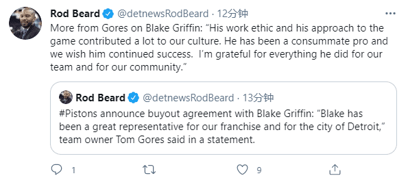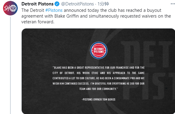 活塞老板Tom Gores声明:格里芬一直都是球队和底特律的杰出代表,他的职业道德和他对比赛的态度对我们的球队文化贡献很大;他是一个完美的职业球员,我们祝愿他继续取得成功,我很感激他为我们的球队和社区所做的一切。