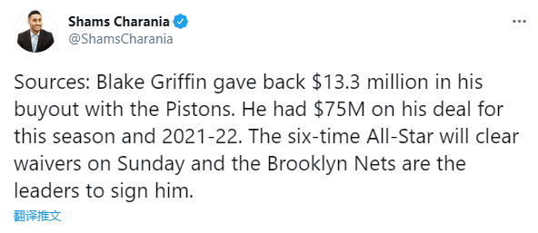 格里芬被买断的合同细节曝光,据名记shams报道格里芬放弃1330万美元的薪水,活塞需要支付给格里芬5650万美元;格里芬将在48小时澄清期后成为完全自由球员,将在下周一恢复自由身。