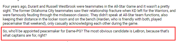 利拉德和乔治积怨已久,但他们将组成一队,这意味着詹姆斯队必须有人出面充当和事佬,去年乔治还和利拉德在社交媒体上互喷争吵,之前利拉德季后赛绝杀雷霆,对乔治等人挥手说再见。