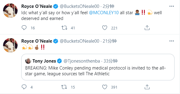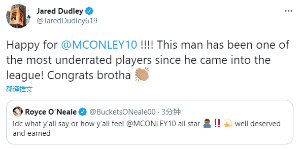 米切尔先是发推写道:我看到你了,康利;戈贝尔则是直言让我们一起加油,随后爵士球员奥尼尔发推写道:不管别人怎么说或者什么感觉,康利当之无愧;米切尔评论奥尼尔动态:事实100%。
