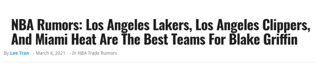 通常情况下,如果你想争夺总冠军,买断后选择詹姆斯的球队总是一个不错的选择。浓眉伤停的时间段,湖人需要一位大个子,格里芬可以帮助湖人走出困境,浓眉回来后,他也能扮演好替补内线的角色。