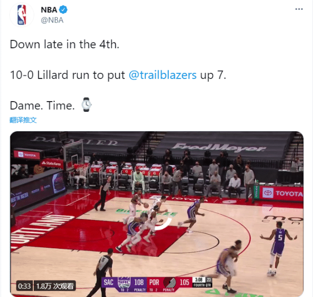NBA官推没到比赛结束,便已经发布了利拉德这关键时刻连得10分的集锦,并且写道:“利拉德时间,到了!”还PO了一个手表的图案!利拉德现在的表演,实在太令人陶醉了。