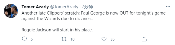 本来乔治是在快船首发名单上的,还参加了热身训练,可赛前快船临时改变首发阵容,宣布乔治因头晕而缺席比赛,小卡则是复出参加比赛;赛前泰伦卢表示他昨天和小卡乔治一起研究进攻战术,难道乔治熬夜累得头晕吗?对于这样的突发情况,快船记者发推表达失望的心情。