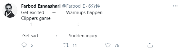 快船记者Farbod发推写道,快船的比赛的情况是——让人兴奋、开始热身、突发伤病和让人难受,这应该代表了很大一部球迷的心里变化;乔治因头晕临时退赛,快船首节进攻一般,小卡开场就跳投得分,但首节早早两次犯规,被迫提前下场。