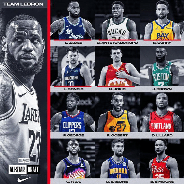 詹姆斯队首发:詹姆斯、字母哥、库里、东契奇、约基奇;