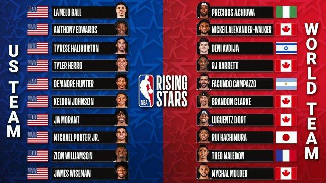 世界队的球员包括:来自加拿大的巴雷特(尼克斯)、亚历山大-沃克(鹈鹕)、克拉克(灰熊)、多尔特(雷霆)、穆尔德(勇士),来自尼日利亚的阿丘瓦(热火),来自日本的八村垒(奇才),来自以色列的阿夫迪亚(奇才),来自阿根廷的坎帕佐(掘金),来自法国的马勒东(雷霆)。